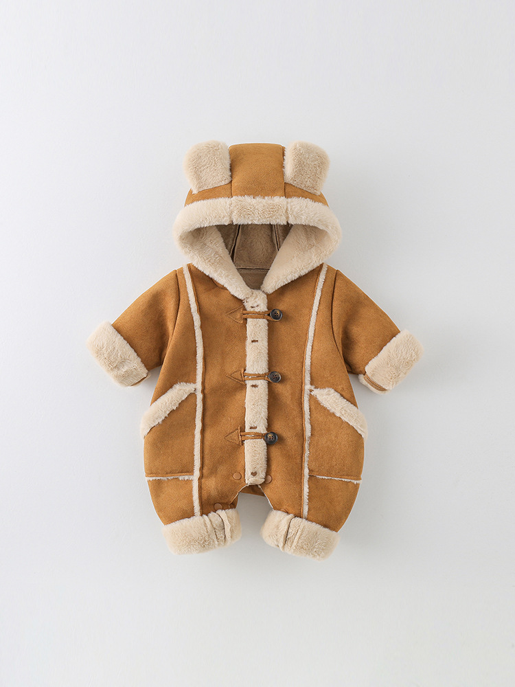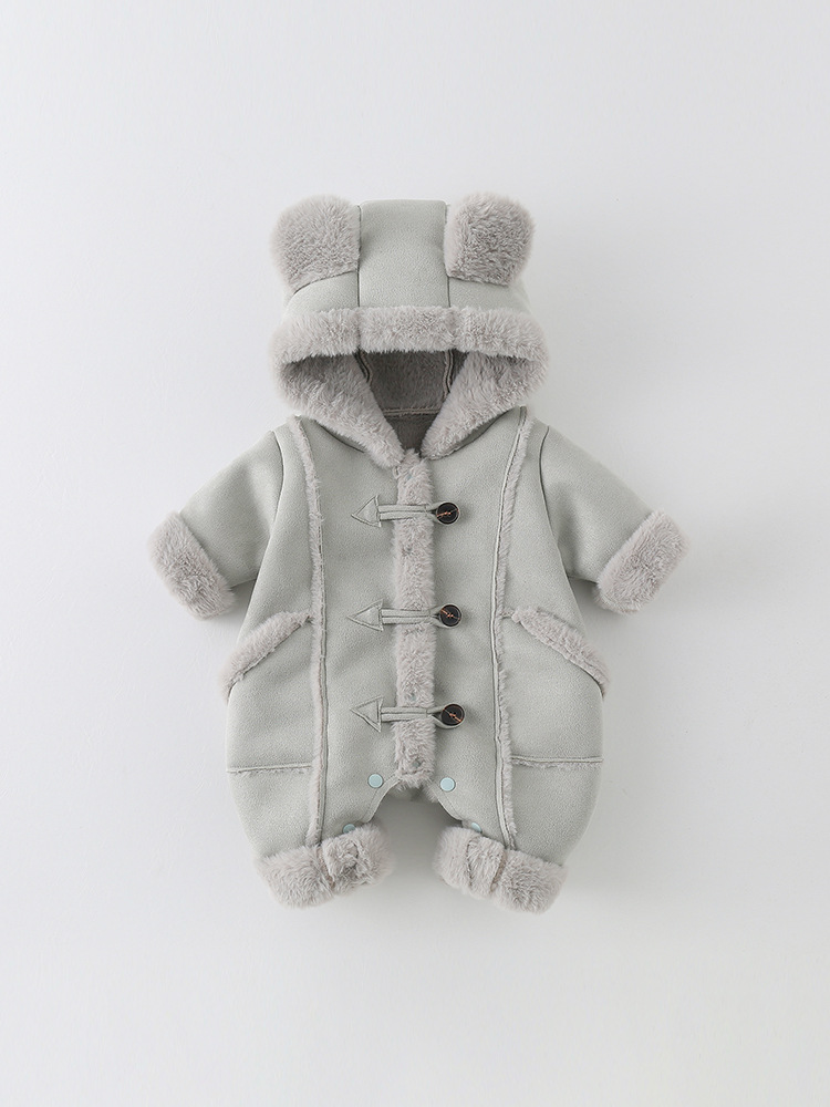 This baby winter padded romper features an adorable bear-ear hood design, combining warmth, comfort, and cuteness in one cozy piece. Made with soft, skin-friendly fabric and a thick insulated lining, it keeps your baby warm and protected during cold weather.