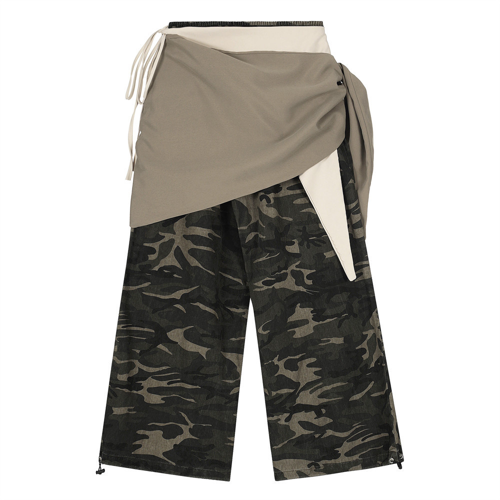 Designed with an elastic waistband for easy wear, these trousers adapt well to different body shapes. The layered front panel and camo pattern add depth and individuality, making this piece a standout item for casual outfits, travel, or fashion-forward looks.