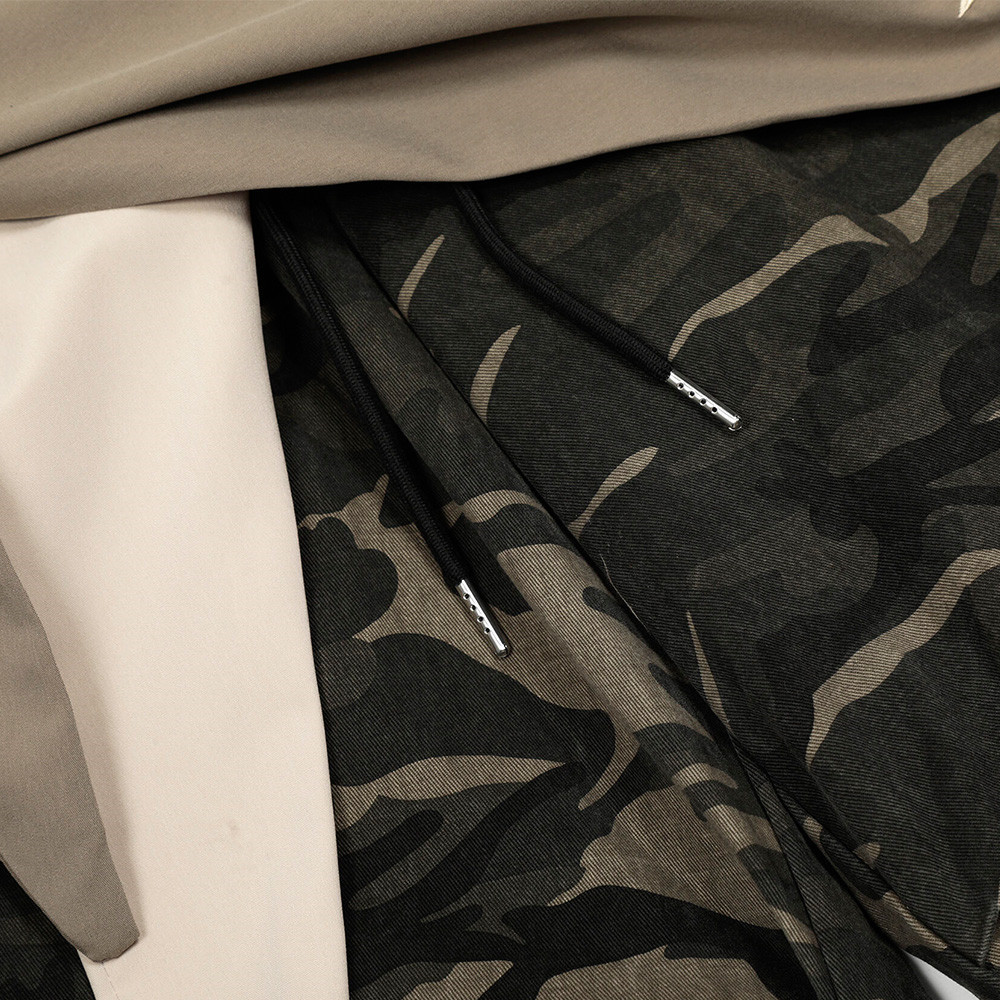 These men’s camouflage pants feature a bold patchwork design combined with functional tie details, creating a strong high-street and utility-inspired aesthetic. The relaxed straight-leg fit offers freedom of movement and a comfortable wearing experience, making them suitable for everyday wear and street styling.