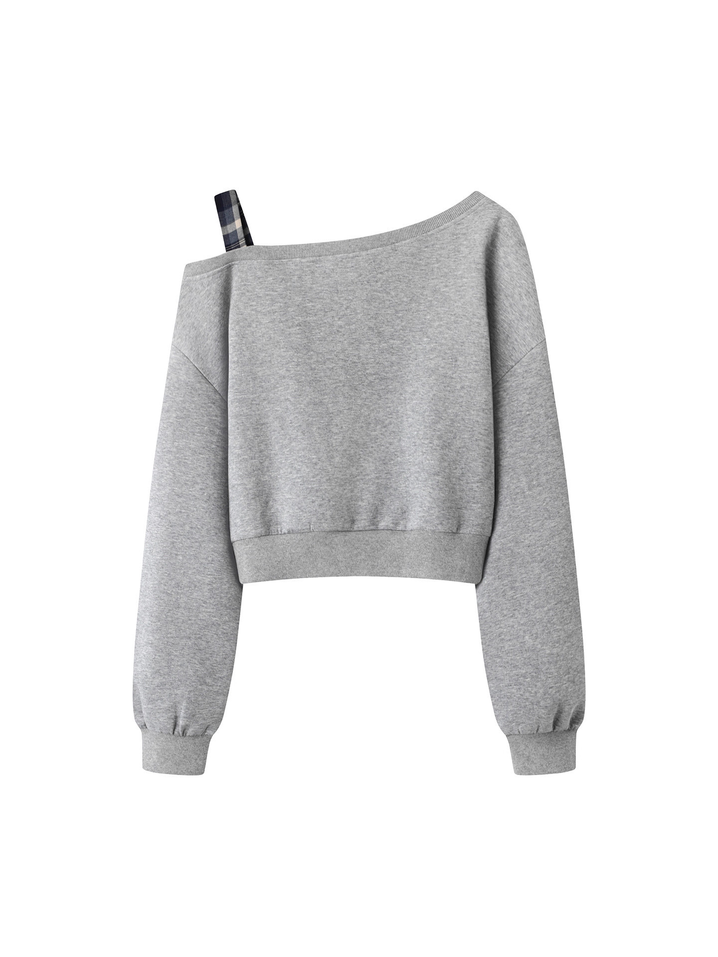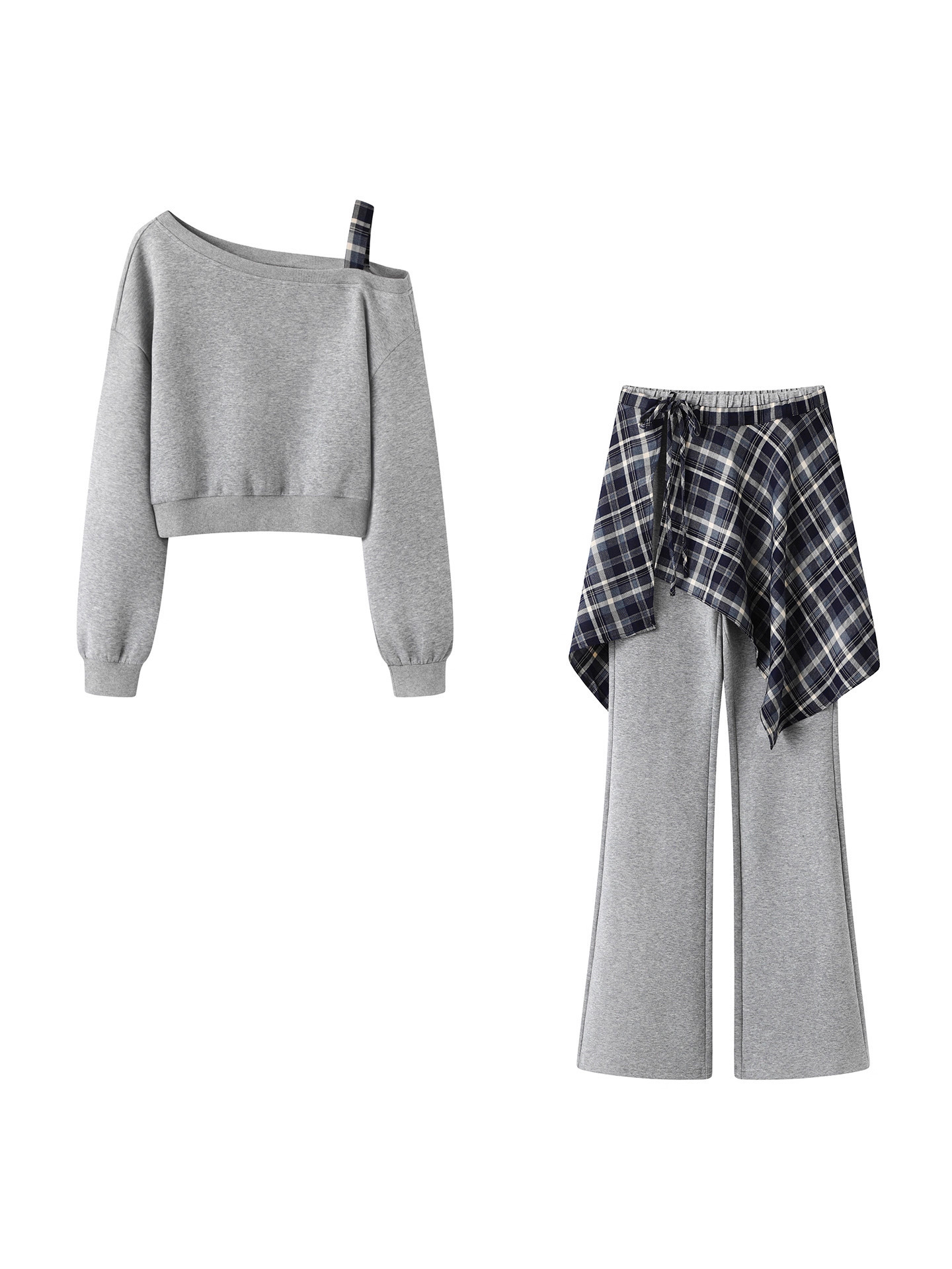 Women’s Asymmetrical Off-Shoulder Casual Set | Cropped Sweatshirt & High-Waist Wide-Leg Pants | Plaid Wrap Detail