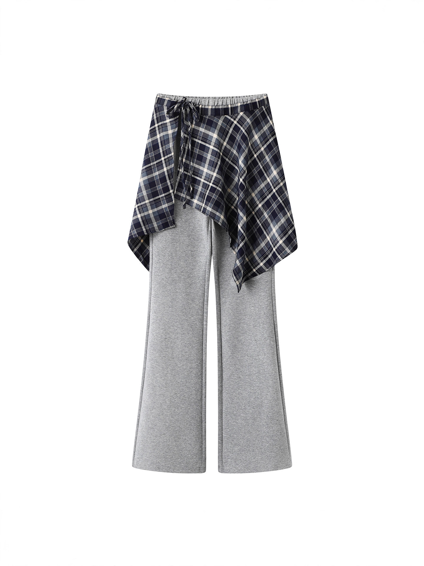 The matching high-waist wide-leg pants are designed with a plaid wrap overlay at the waist, creating a layered look that enhances proportions and adds visual interest. The loose fit offers excellent comfort and flatters various body types, making it ideal for everyday wear.