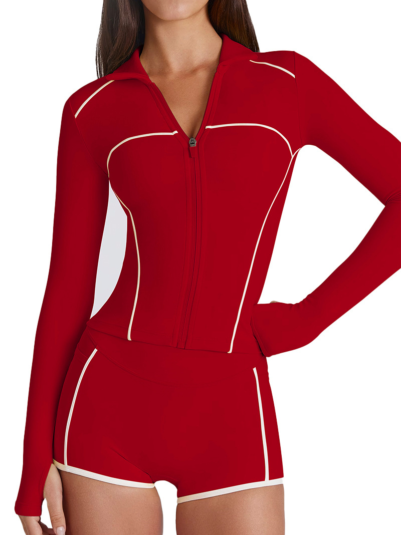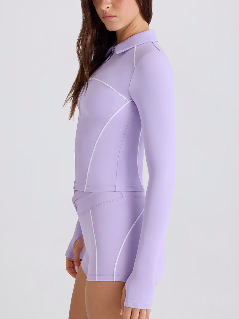 The zip-up long sleeve top with a stand collar offers adjustable coverage and easy wear. The fitted cut follows the natural curves without restriction. The high-waist bottom provides secure support and a flattering fit, staying in place during active movement.