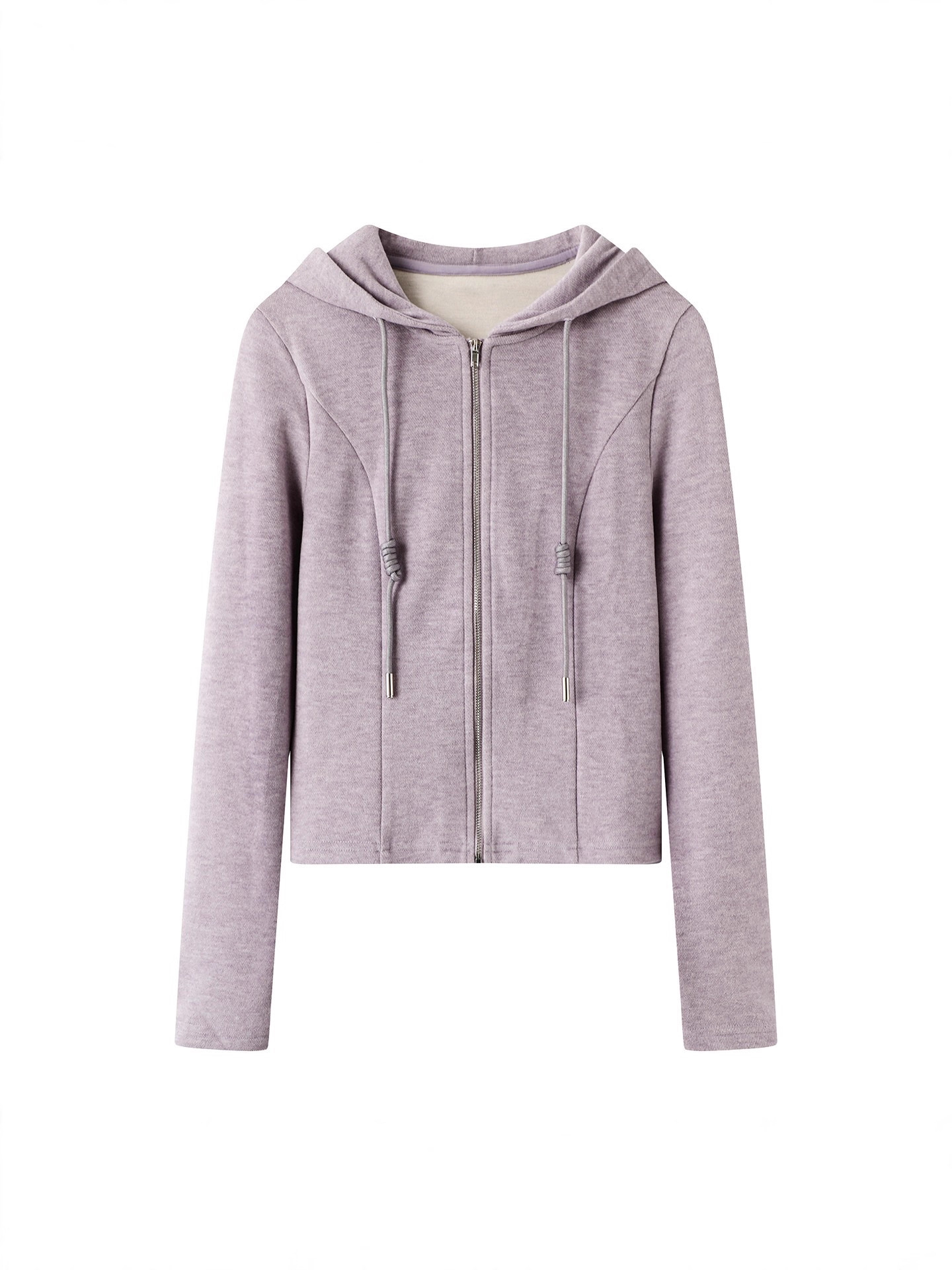 This women’s casual two-piece set features a clean and modern design with a soft, elegant tone. The cropped hooded jacket comes with a full front zipper and adjustable drawstrings, offering both comfort and a flattering fit. Seam detailing enhances the overall structure and adds subtle style.