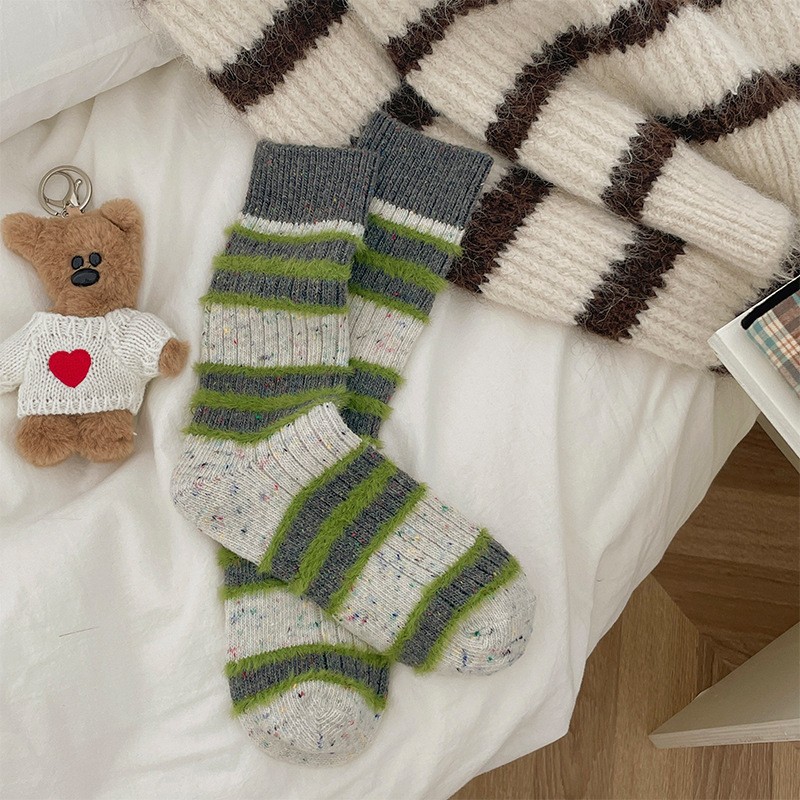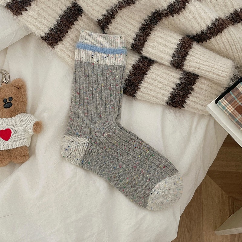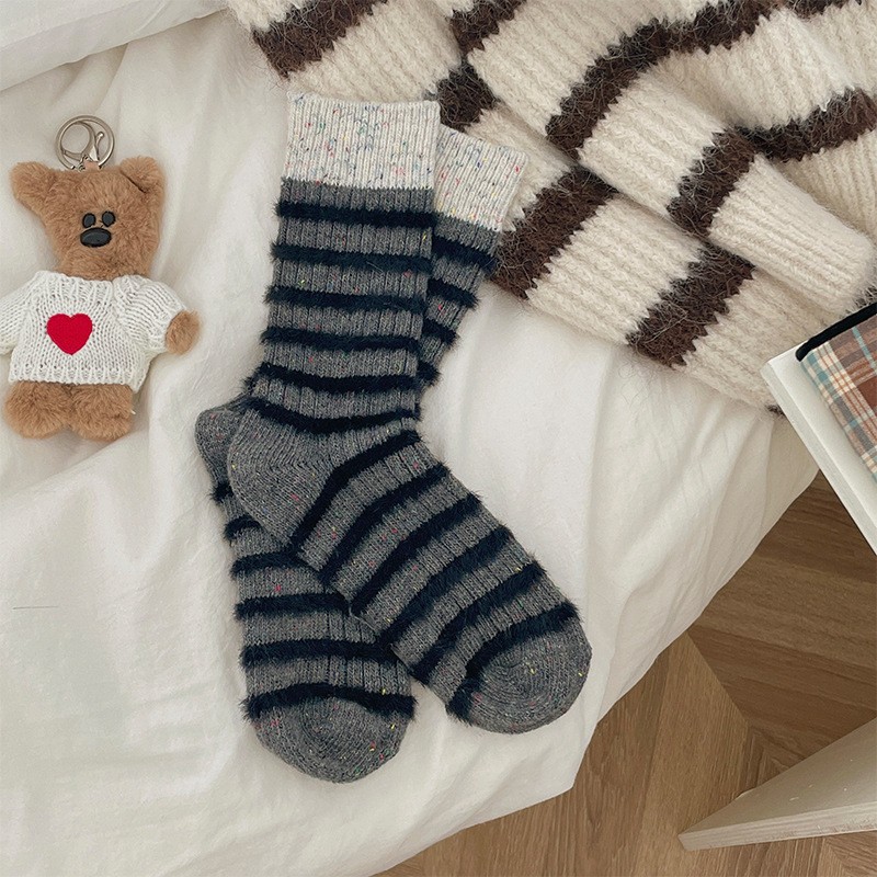 This women’s crew socks set features a soft cotton-blend terry fabric with a vintage striped design and subtle speckled yarn details. Comfortable, warm, and breathable, these socks are perfect for everyday wear during fall and winter.