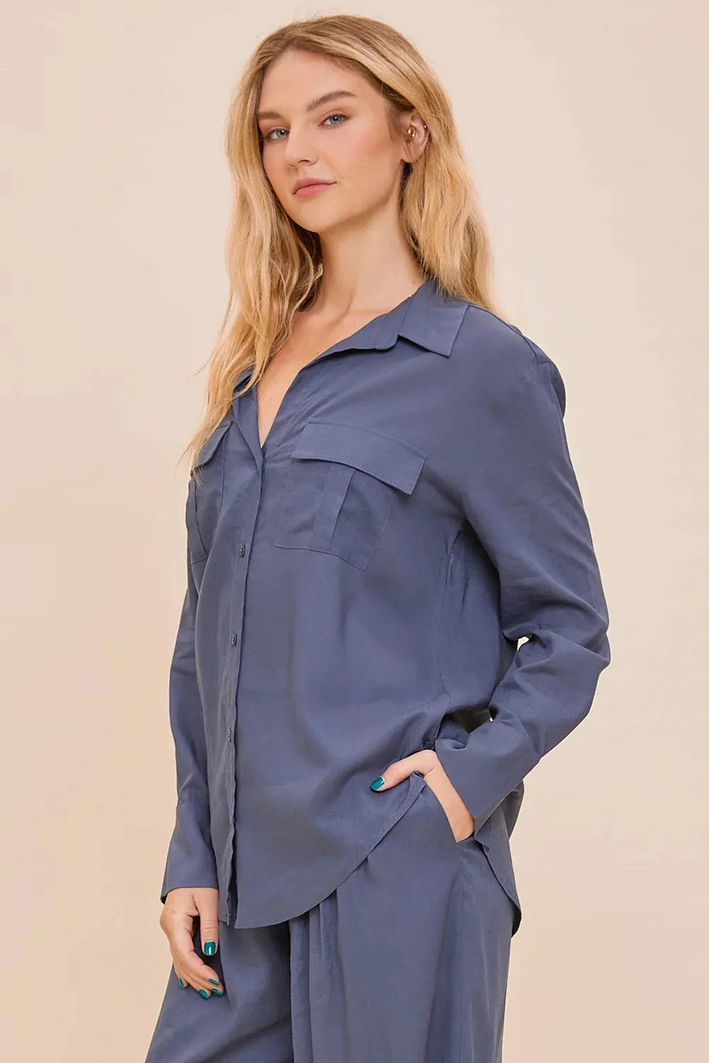 Blue Oversized Button-Up Long Sleeve Shirt with Pocket