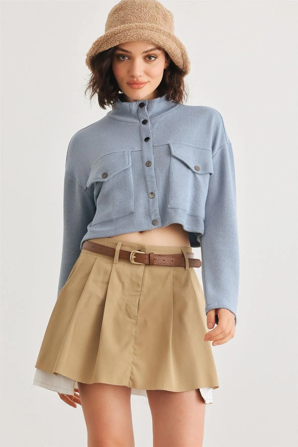 Blue Moon Crew Neck Long Sleeve Crop Jacket with Pockets